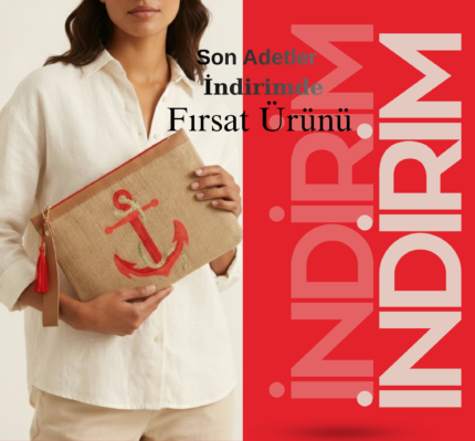 Kırmızı Çapa Nakışlı Jüt Clutch Çanta 30×20 cm