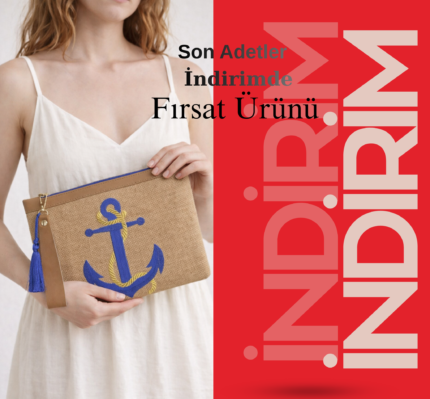 Çapa Nakışlı Jüt Clutch Çanta 30 × 20 cm
