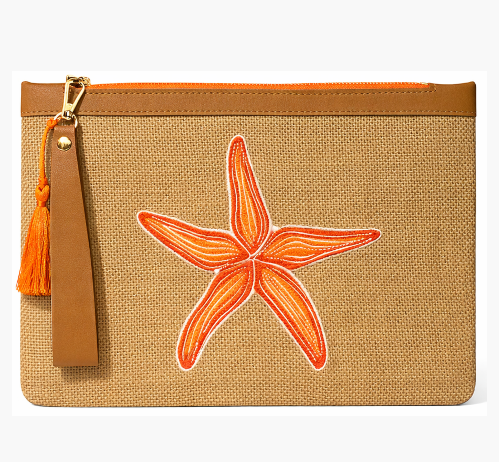 Deniz yıldızı nakışlı doğal jüt clutch çanta. 30×20 cm ölçü, vegan deri askı ve yazlık deniz teması.