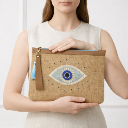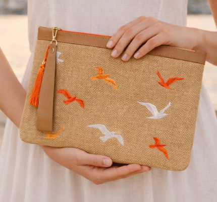 Doğal jüt kumaş üzerine işlenen kırmızı deniz yıldızı nakışı, bu clutch çantaya güçlü ve enerjik bir yaz karakteri kazandırır. El işçiliği detayları ve canlı rengiyle sahil stilini öne çıkarırken, fermuarlı yapısı ve vegan deri bilek askısı sayesinde pratik ve şık bir kullanım sunar. Yaz, tatil ve günlük kombinler için ideal bir tamamlayıcıdır.
