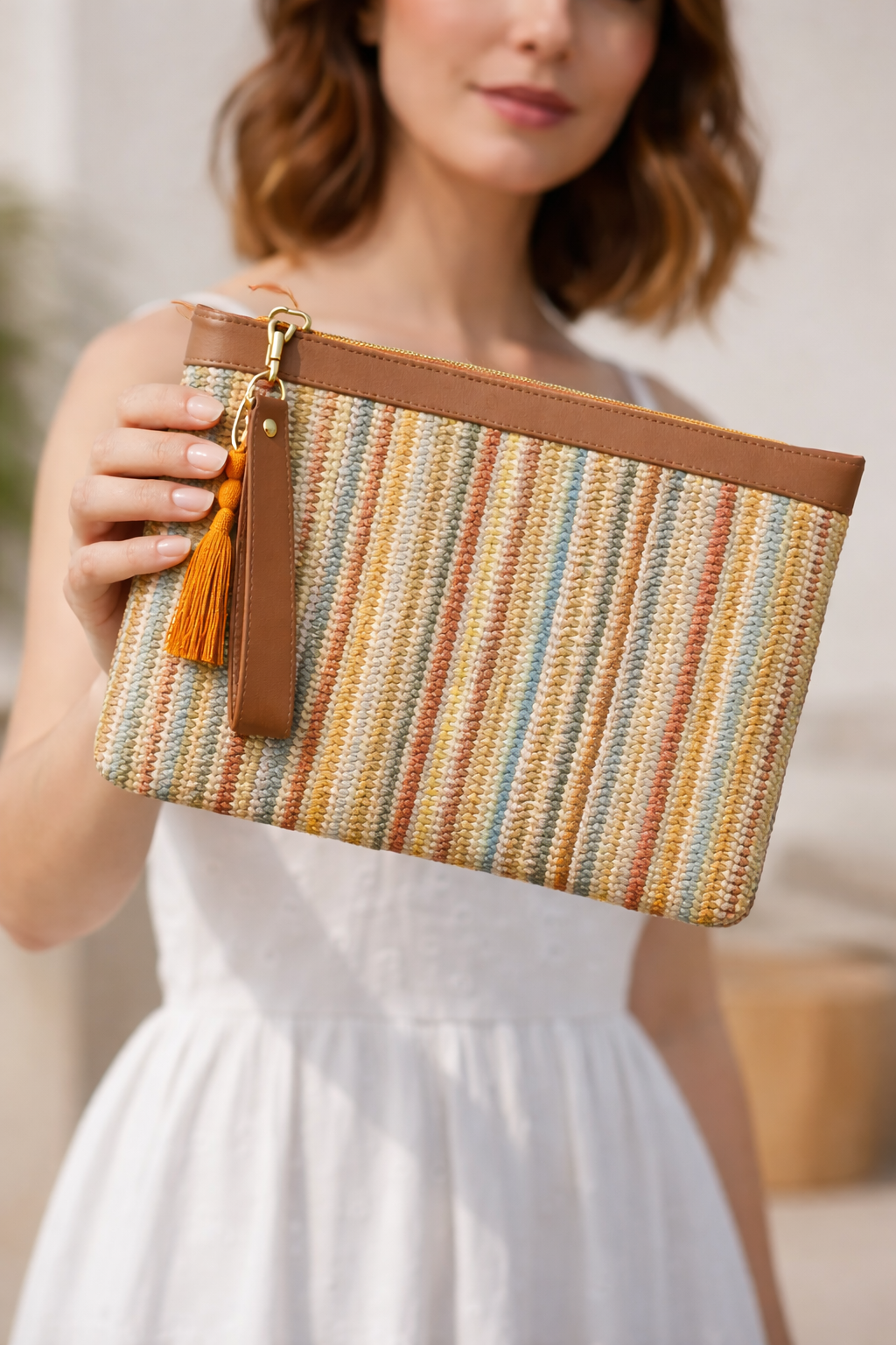 Doğal dokuma jüt kumaştan üretilen bu çizgili clutch çanta, yaz ve bahar kombinlerine sıcak ve enerjik bir karakter kazandırır. Çok renkli dokuma deseni, el işçiliği hissini modern bir stil ile birleştirirken; vegan deri detaylar tasarıma zarif bir denge katar.