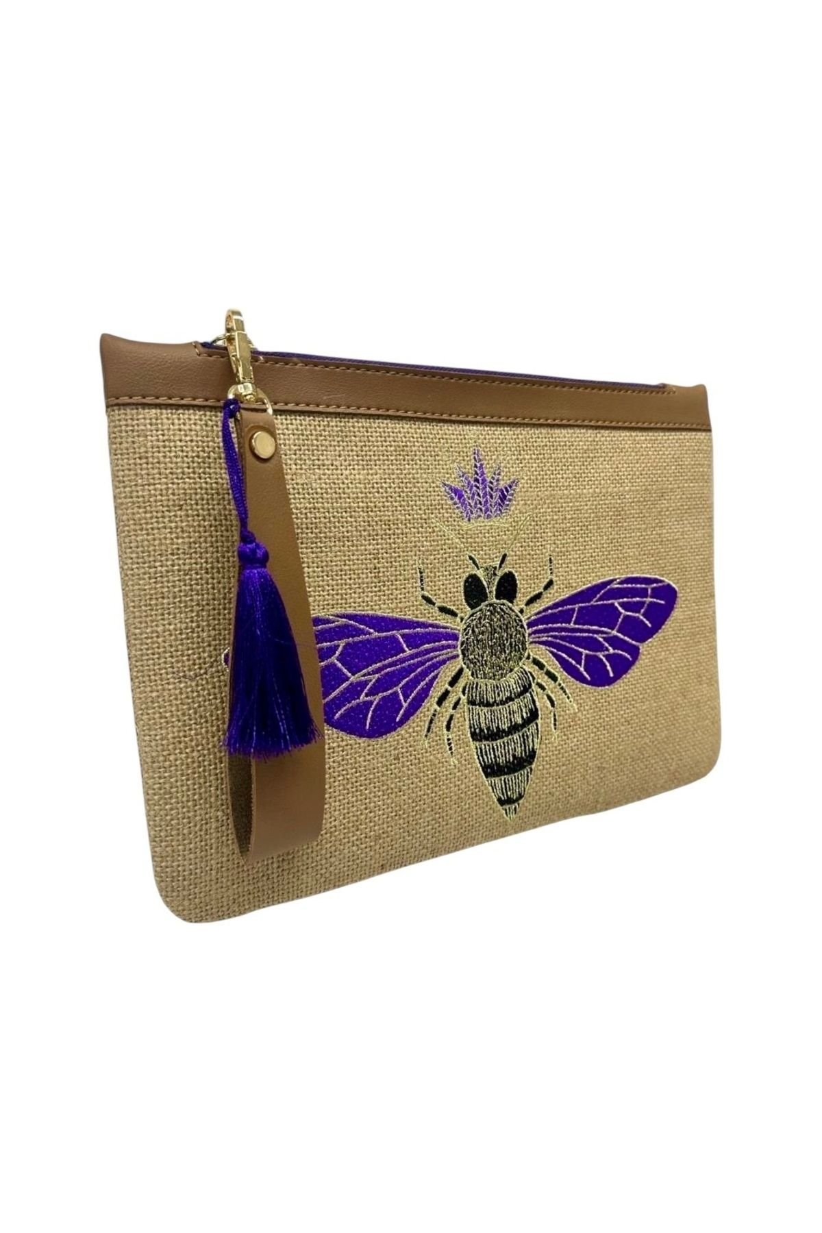 Mor arı nakışlı, doğal jüt kumaştan üretilmiş 30×20 cm clutch çanta. Güçlü ve dikkat çekici bir stil tamamlayıcısı.