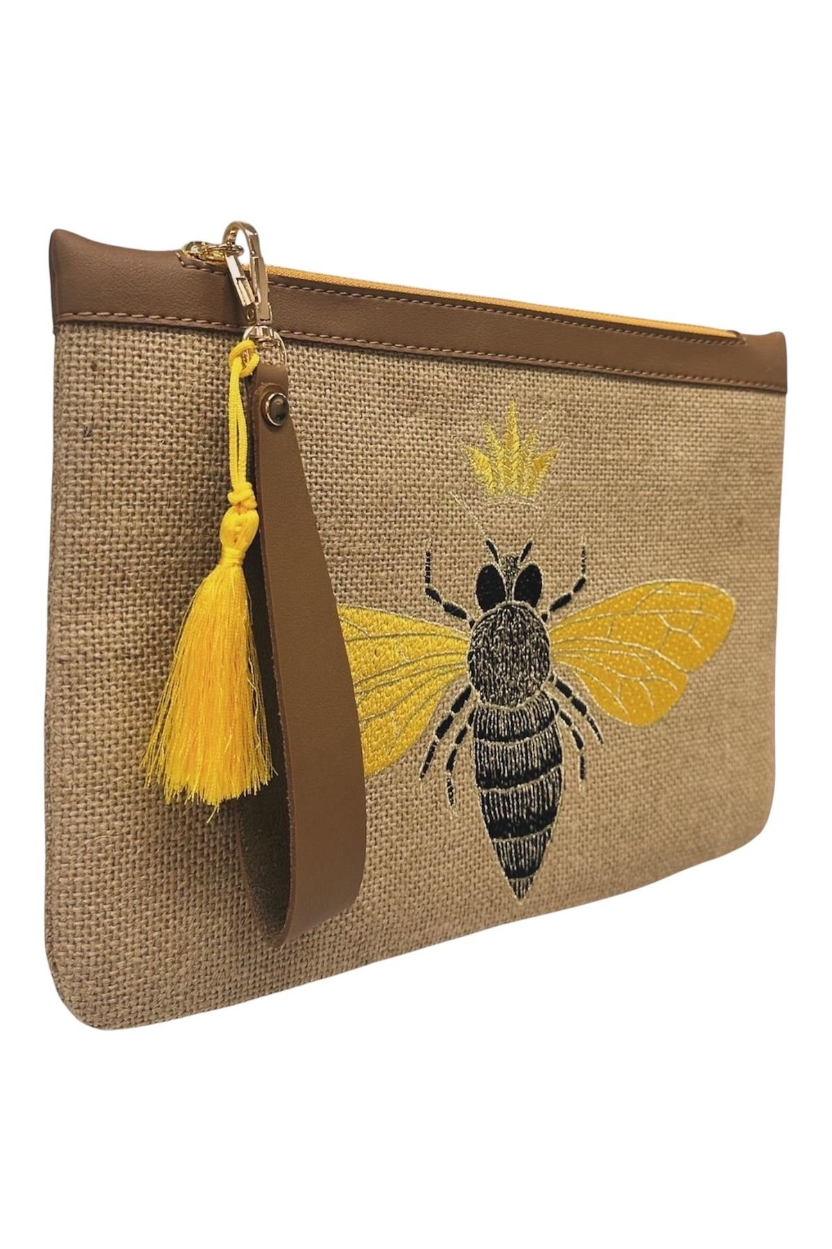 Taçlı arı nakışlı, doğal jüt kumaştan üretilmiş 30×20 cm clutch çanta. Şık ve güçlü bir stil detayı.
