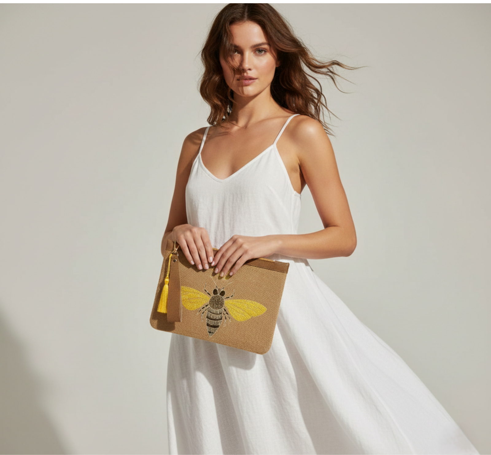 Gücü ve zarafeti simgeleyen taçlı arı nakışıyla tasarlanan bu jüt clutch çanta, el işçiliği detaylarıyla dikkat çeker. Doğal jüt kumaş üzerine işlenen sarı ve siyah arı motifi, çantaya enerjik ve sofistike bir karakter kazandırır. Günlük kombinlerden yaz davetlerine kadar stilinizi tamamlayan özgün bir aksesuardır.